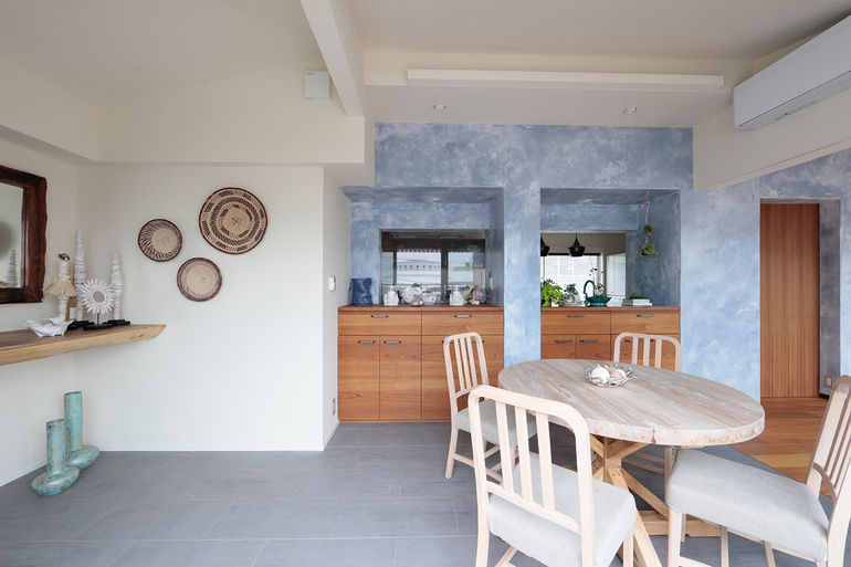 家の中央に構えるブルーの壁は、セニデコアバナという漆喰の一種で、顔料を混ぜ合わせ調色し、さらに顔料により模様をつけたのちコテで磨き上げていく。こうして出来た壁は、しっとりとした質感と豊かな表情を持つ。光が当たることで表情が変わる様子は、空や海を連想させ、ハワイやバリの調度品がよく映える。南国香る空間で、ひとり好きなものを眺めること、仲間と集まりパーティーやヨガを楽しむことは、どれも上質な時間となるだろう。
