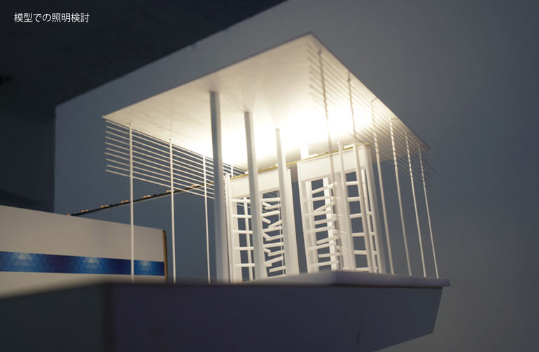 華奢な部材の組み合わせで構成されたゲートは、緑豊かな周辺環境にとけこみながら、緊張感あるたたずまいとしている。帰宅時にはライトアップされ、繊細なルーバーが浮かび上がり柔らかな表情をつくる。1日の終わりに、ほっとする暖かい風景を目指した。